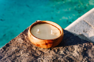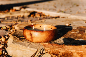 Each candle comes in a different, beautifully carved small wooden bowl
